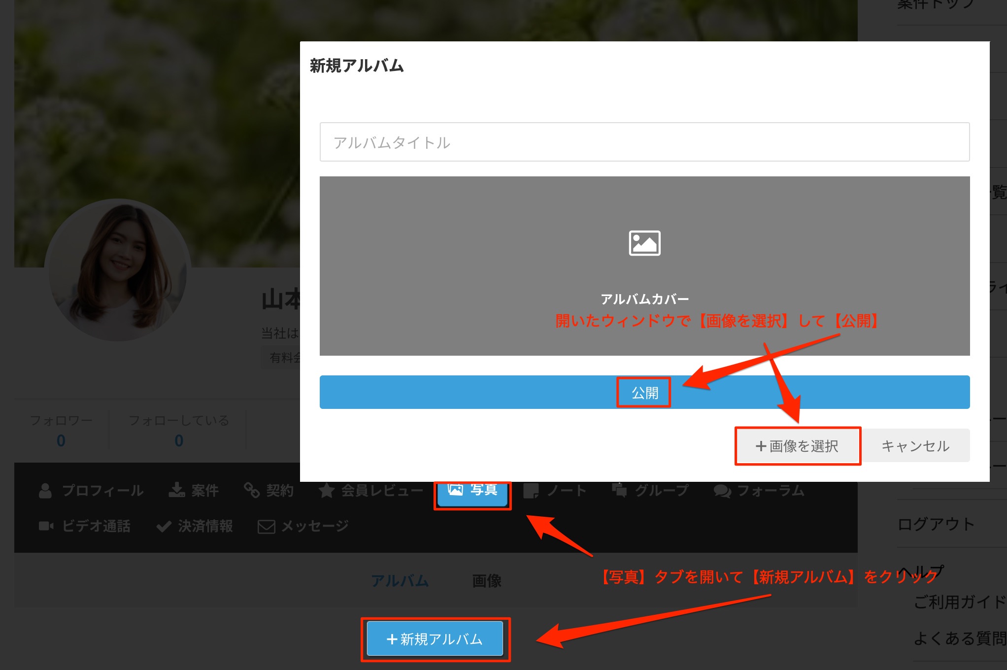写真は会員のプロフィールタブから他の会員に公開されます。