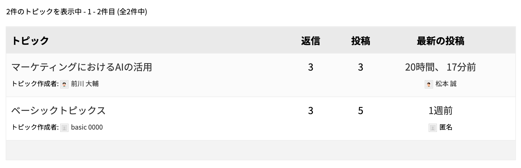 「投稿したトピック」では、会員がフォーラムに投稿したトピックが一覧表示されます。リンクをクリックするとフォーラムのトピックが表示されます。