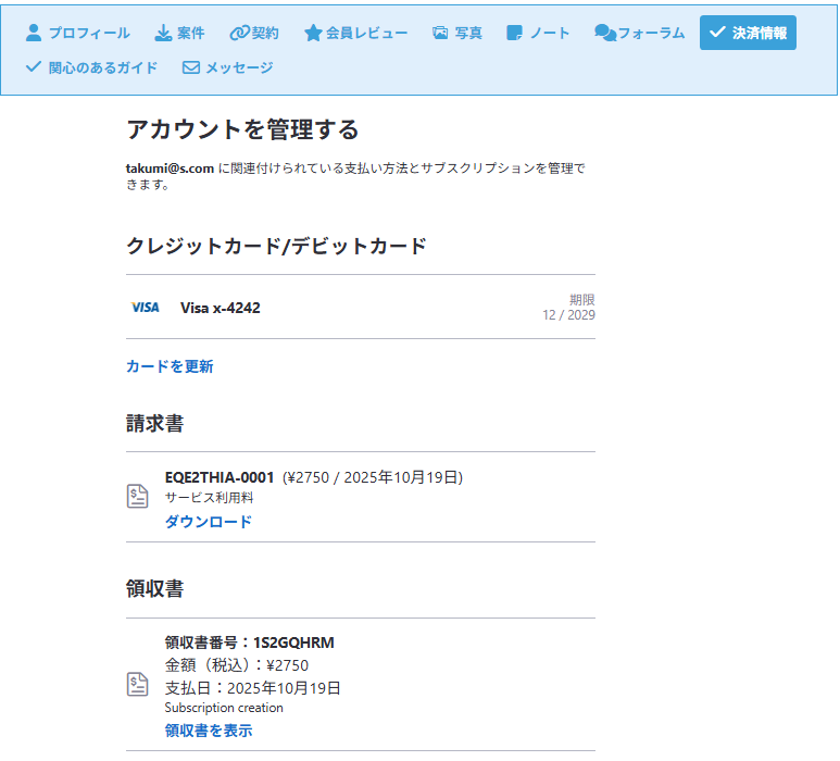 また、支払いに使用しているクレジットカードの変更、請求書及び領収書のダウンロードができます。