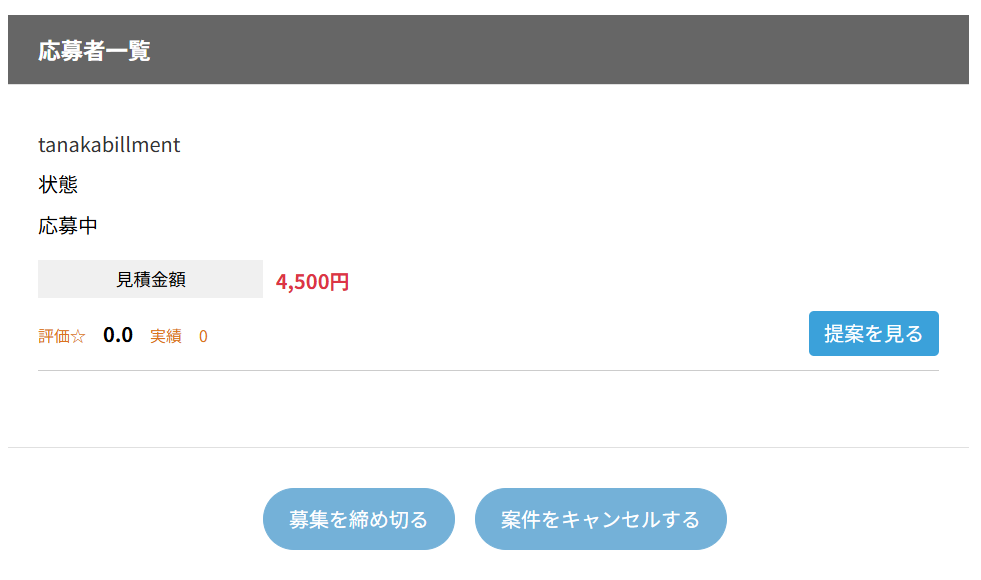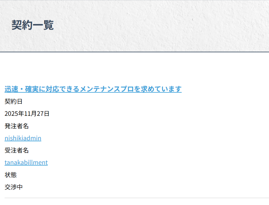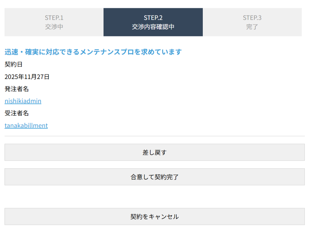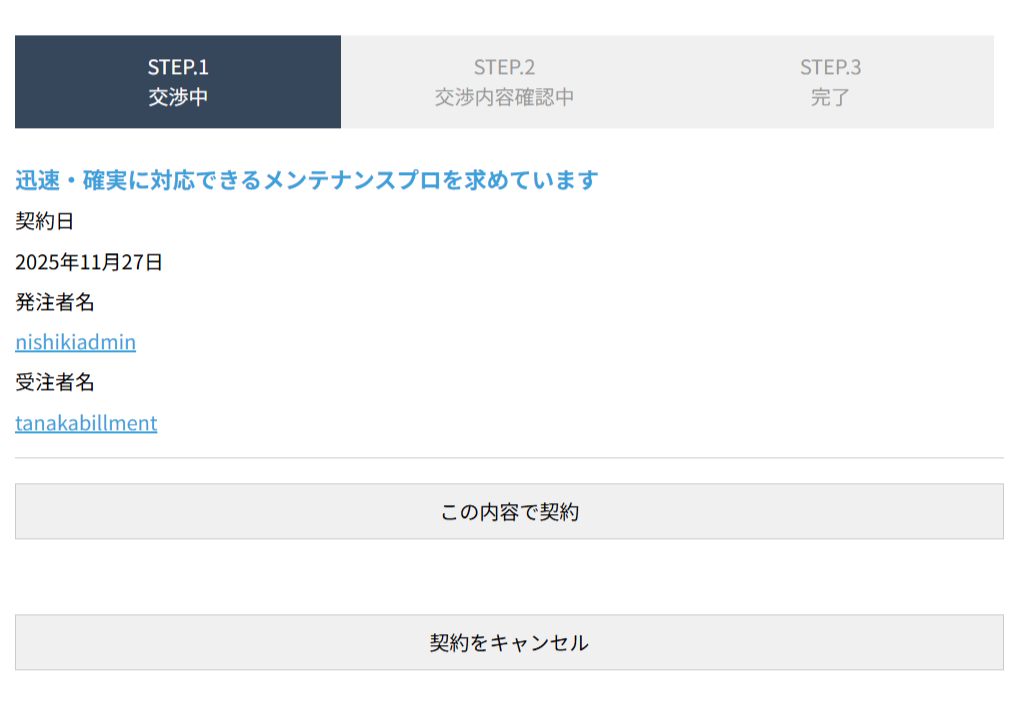 その後、案件を登録した側と応募者の双方がシステム上で契約に同意すると、契約が正式に成立します。