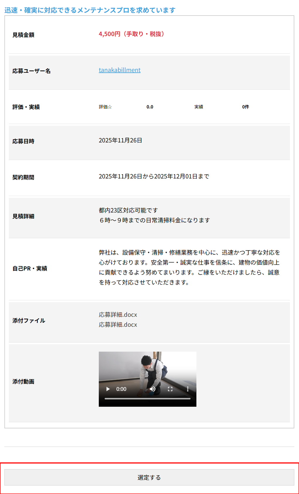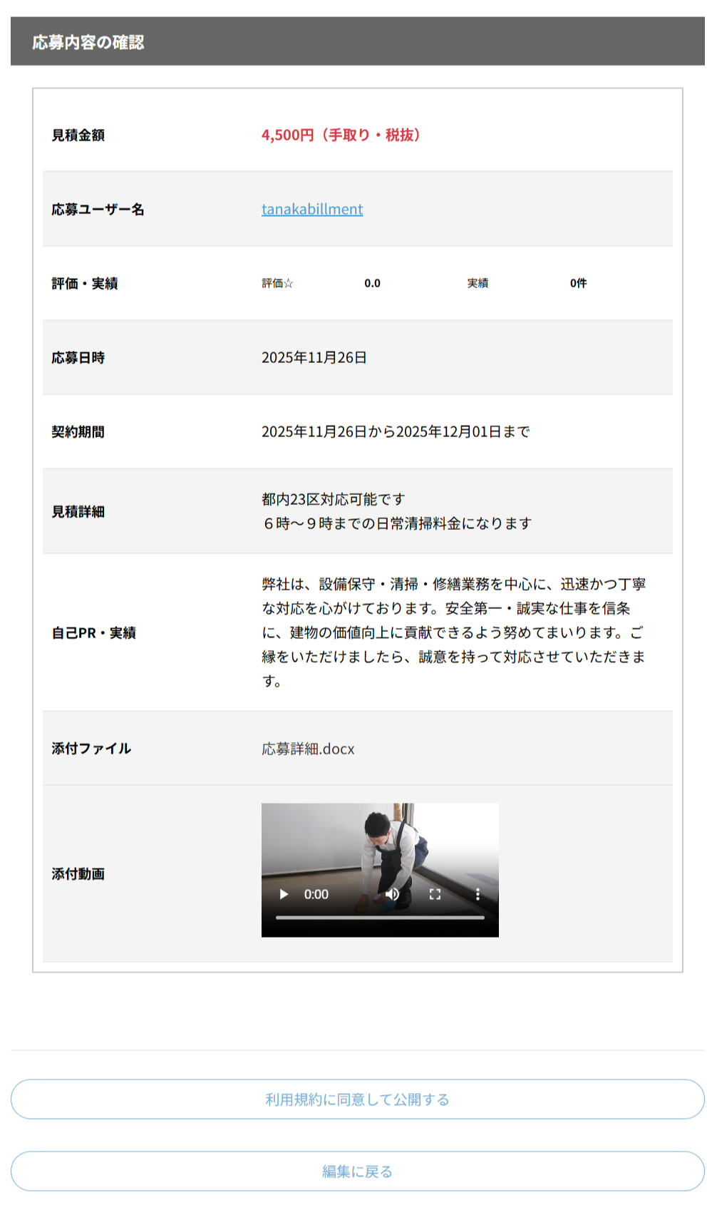 案件表示ページから「応募する」をクリックすると、案件応募ページが表示されます。できるだけ詳しく記入したほうが、応募内容を理解してもらいやすく、選定される可能性が高まります。また、文字だけで伝わりにくいことは、画像やPDFを添付したり、スマホで撮影したショート動画(1分まで)を投稿することで、応募の内容をスムーズに表現することができます。
