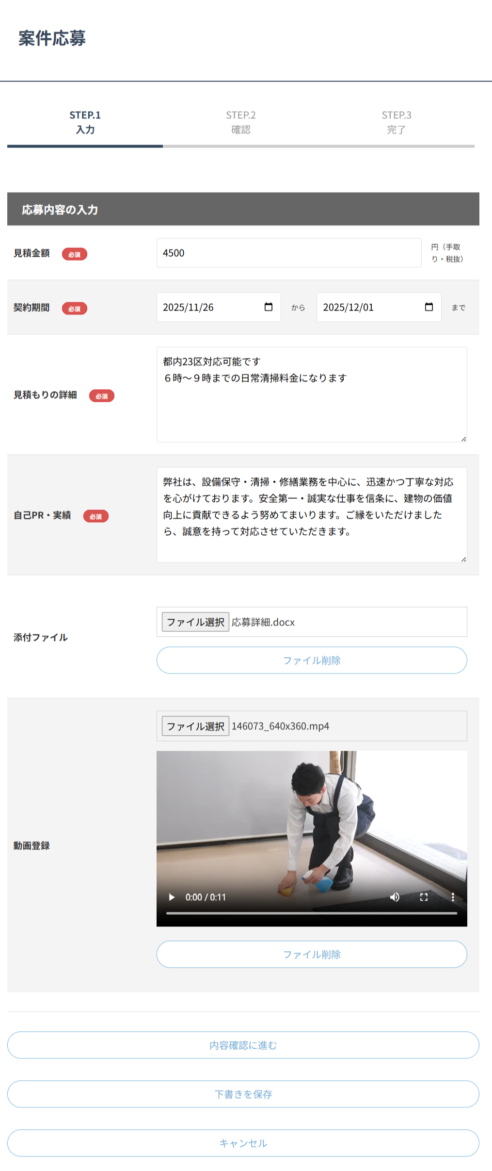 入力には時間がかかる場合もあります。途中で入力を止めて、後から続きをしたいときは「下書きを保存」をクリックしてください。次回、案件応募ページを表示したとき、自動的に下書きが読み込まれます。