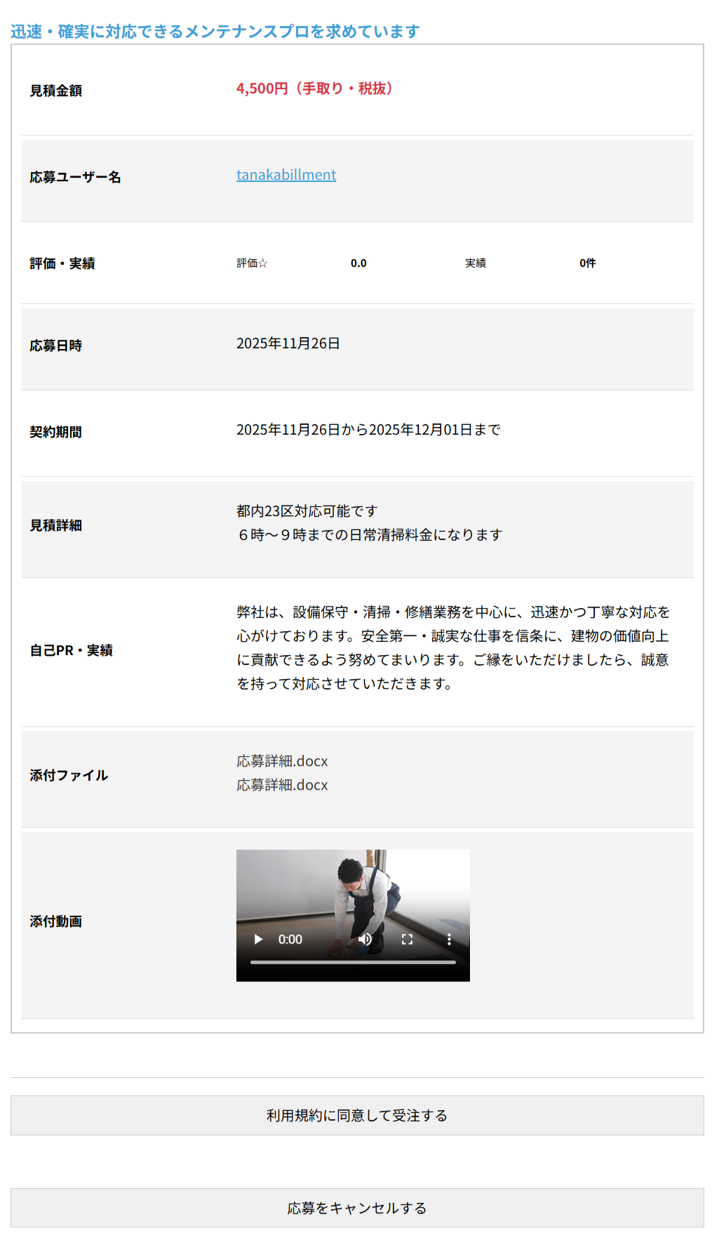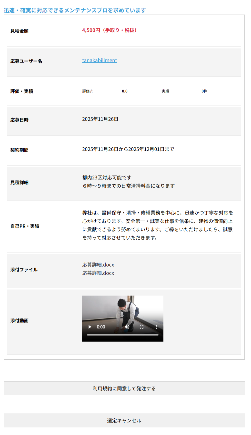 応募者が条件を確認し、「利用規約に同意して受注する」ボタンをクリックすると、契約内容の確認画面(契約表示画面)が表示されます。