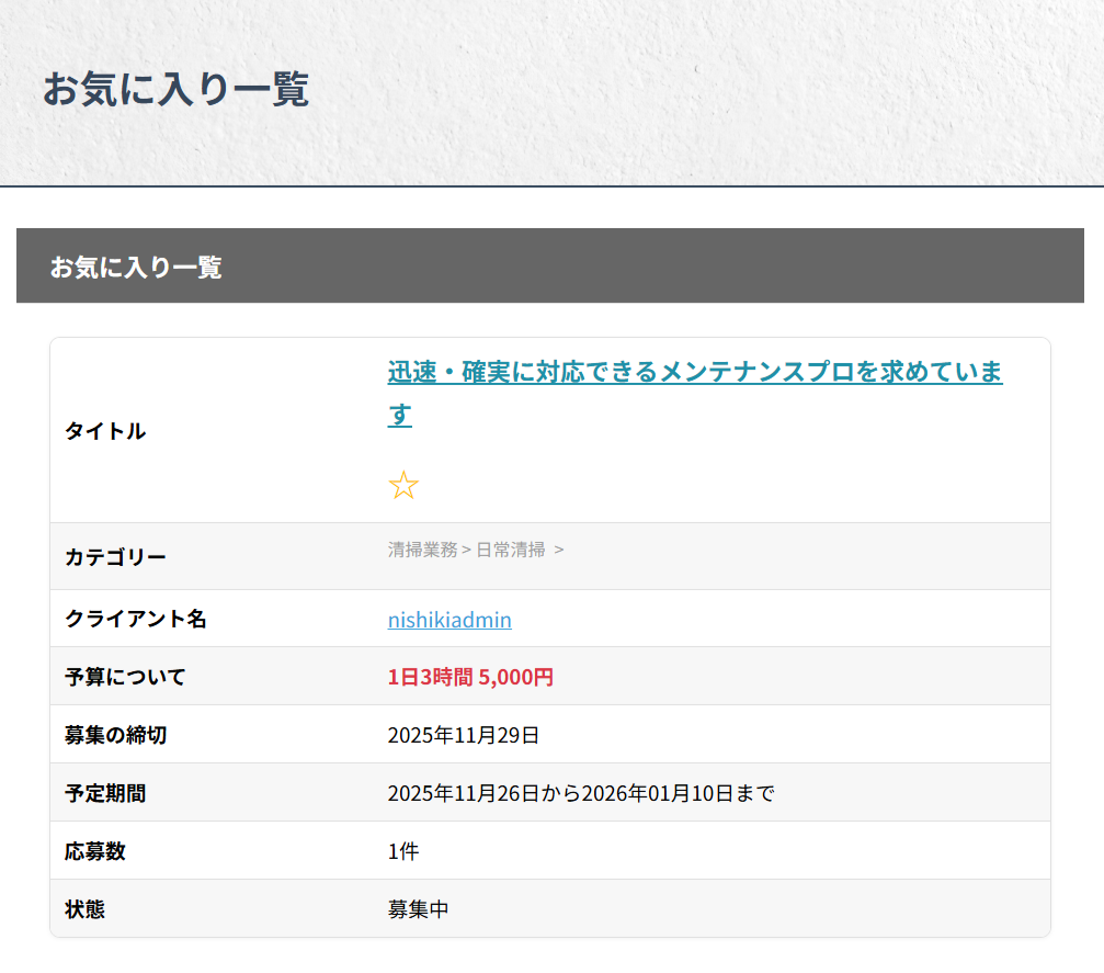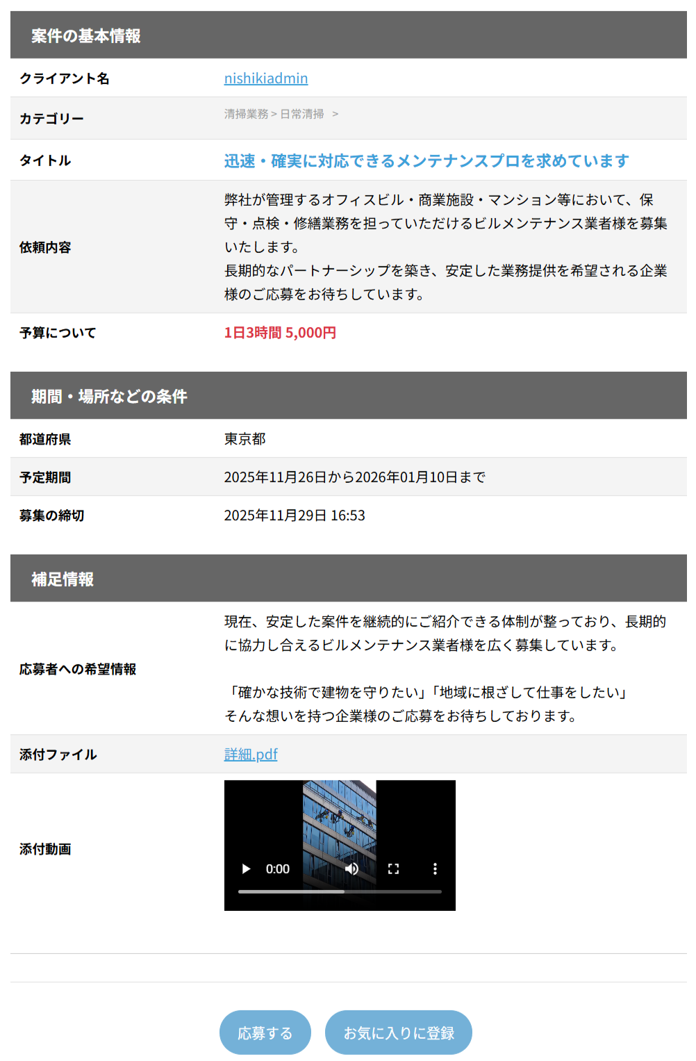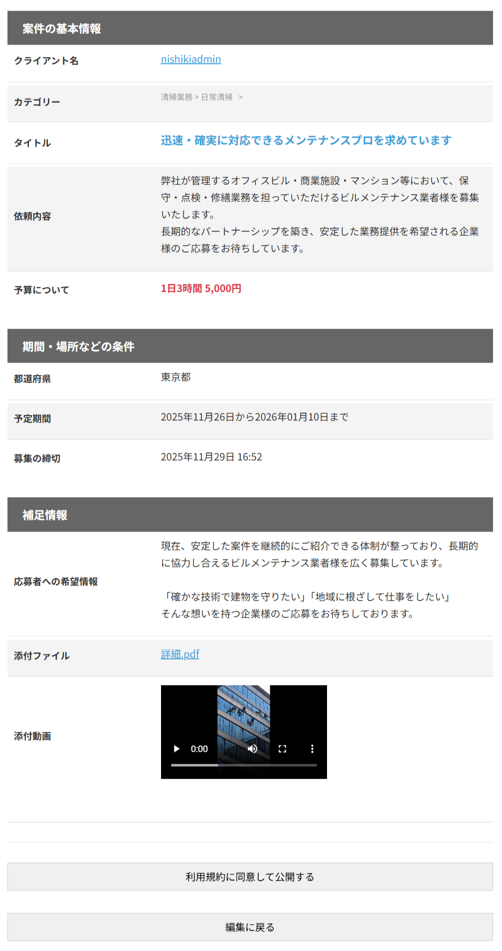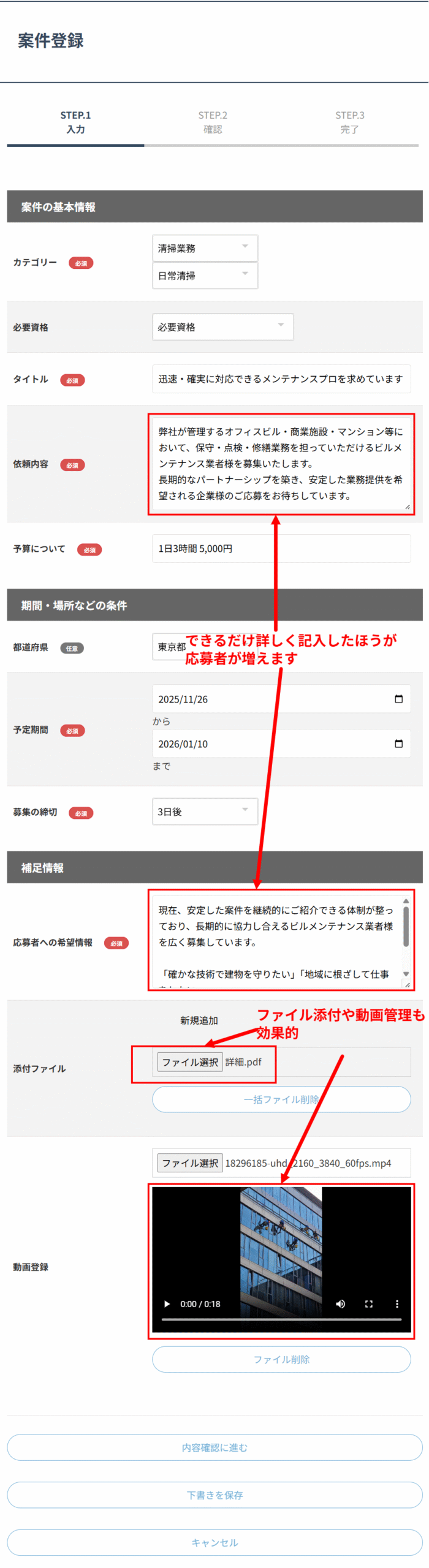 できるだけ詳しく記入したほうが、案件について理解が深まるため、応募者が増えます。また、文字だけで伝わりにくいことは、画像やPDFを添付したり、スマホで撮影したショート動画(1分まで)を投稿することで、案件の内容をスムーズに案内することができます。